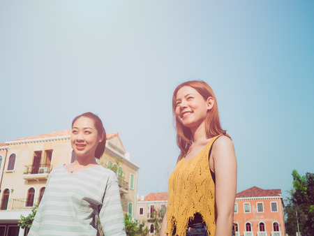 Two Asian tourist girls walking around the city for sightseeing with one of them leading the way.
