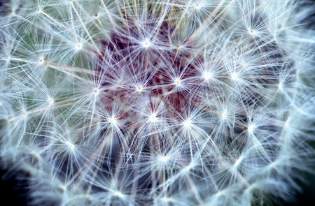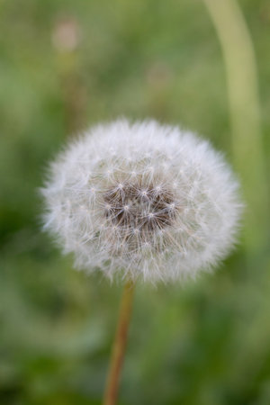 The same white and dry dandelion from the top with a lot of small bunches. Round as a ball, on a hot summer day, on the shady side, with a green, colored, fuzzy soil background. Macro photography.