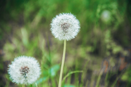White fluffy dandelions, natural green blurred spring background, selective focus.
