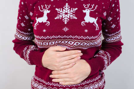 Bellyache concept. Close up photo of men in red winter sweater with deers holding his stomach isolated on red background