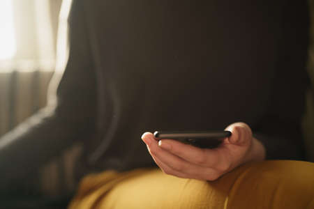 Cropped shot of young college girl take a break with smartphone while sitting on chair in modern living room