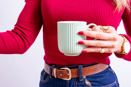 Woman holding a light green mug, wearing a red top, brown belt, and jeans