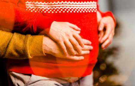 Husband hugs his wife pregnant belly. Christmas atmosphere. Close-up of hands and abdomen