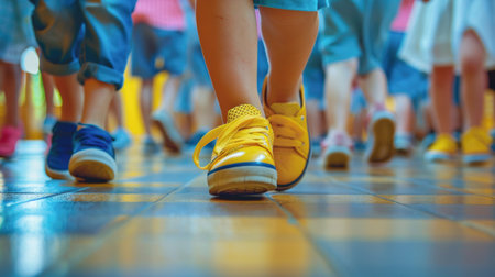Dynamic Low Angle View of Kids' Feet in Colorful Sneakers Walking in School Hallway