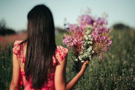 Unrecognizable woman in denim jacket holding bouquet of purple flowers hiding face, standing alone among field in front of blue sky, enjoying of sunlight. Summer outfit. Girl with flowers