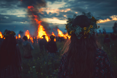 Summer Solstice Revelry: Wreathed Figures by Bonfire
