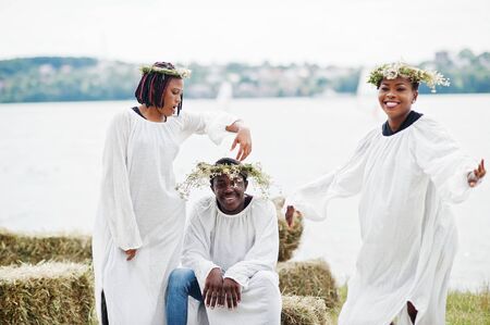 a group of young tangled girls in white dresses, launching flower wreaths in the water hold candles. On a natural background. A rustic style, a national holiday for young brides of Russia and Ukraine