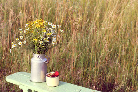 Bouquet wildflowers on a wooden bench next to a cup of red berries on a background of nature / retro still life with daisies and strawberries