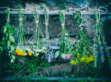bunches of healing herbs - mint, yarrow, lavender, clover, hyssop, calendula, milfoil, herbal medicine