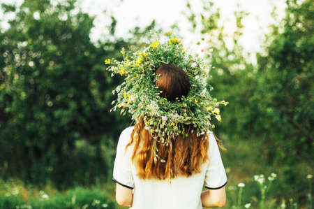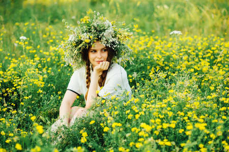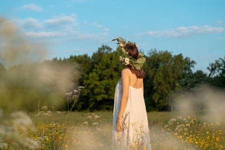 beautiful girl in wreath of flowers in meadow on sunny day. Portrait of Young beautiful woman wearing a wreath of wild flowers. Young pagan Slavic girl conduct ceremony on Midsummer.