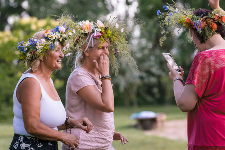 Three women with summer solstice wreaths on their heads are standing in a park and actively discussing what they have photographed on their phones.