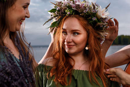 Lovely girls in flower wreaths in nature. Ancient pagan origin celebration concept. Summer solstice day. Mid summer.