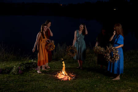 Lovely girls by the fire at night. Ancient pagan origin celebration concept. Night of Ivan Kupala.