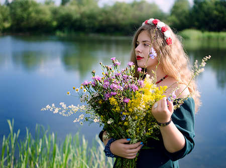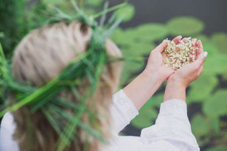 Woman in nightgown with wreath holds elderberry flowers in her hands by the river