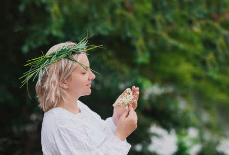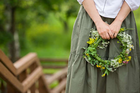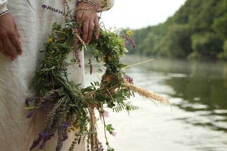 Woman holding flower wreath. Summer solstice day. Midsummer.