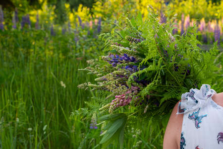A girl in a white blouse holds a wicker basket with a bouquet of wild flowers. Summer walk in the field. midsection.