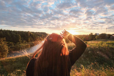 Young adult woman standing alone and staring at orange yellow sunset over river. Girls silhouette closeup. Peaceful atmosphere in summer evening. Back view.