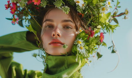 Vibrant close up of a woman with freckles and blue eyes wearing a colorful flower crown in a sunny meadow, conveying natural beauty and tranquil springtime mood. Generated A.I.
