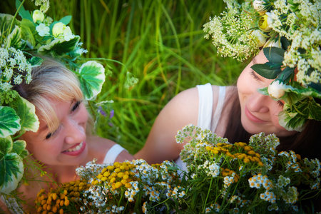 Zhytomyr, Ukraine - July 12, 2016: Close up two Sensual girls with Fresh flowers at head