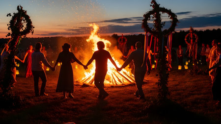 A group of people hold hands and dance in a circle around a large bonfire during a Midsummer festival. The scene is set in a meadow at dusk, with traditional maypoles visible in the background, evoking a sense of cultural celebration.