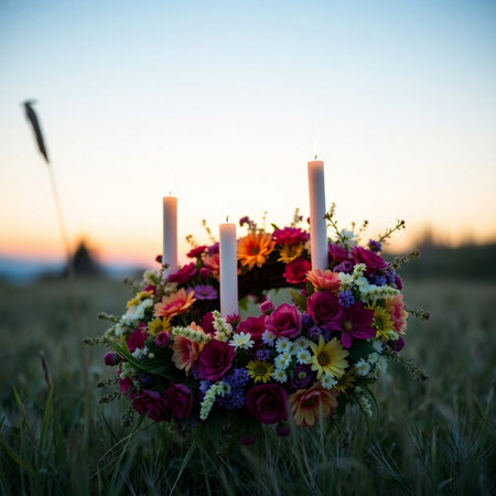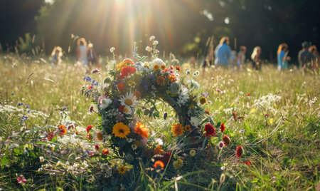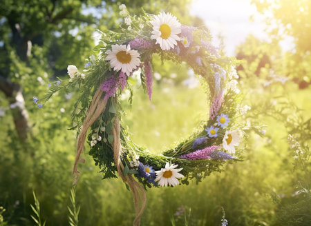 A beautiful flower wreath hangs in a sun-drenched meadow. The vibrant colors and natural beauty create a serene and peaceful atmosphere.