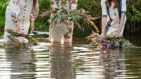 Fortune-telling on wreaths and water, Ivan Kupala holiday, girls throwing wreaths on water, summer holiday and rites.