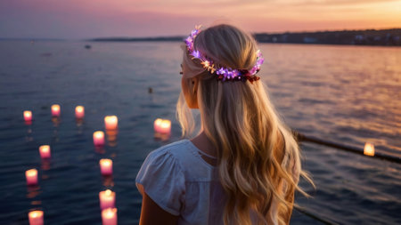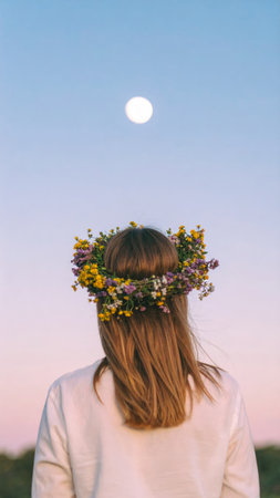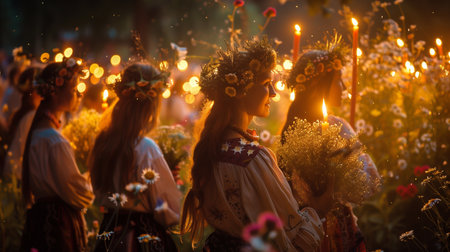 Young women gather in a meadow, celebrating Ivan Kupala, adorned with flowers and candles at dusk