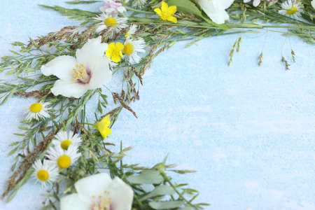 Beautiful bouquet of wildflowers on rustic wooden background. Summer vacation in countryside. Traveling in mountains and gathering wildflowers. Top view with space for text