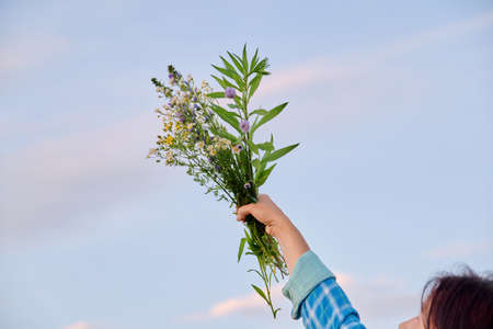 Womans hand with bouquet of wildflowers, sky in clouds background