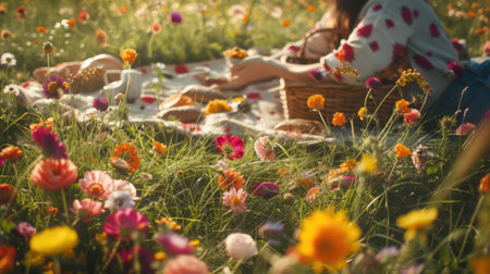 The picture of the person relaxing at the green grass field surrounded with the nature under the sunlight of the bright day of spring, the picnic is activity to relaxing,socializing and eating. AIG43.