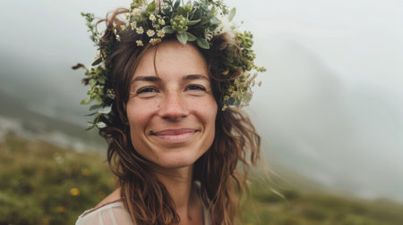 A woman wearing a flower crown on her head is smiling in a field of grass, showcasing a happy and fun headpiece at an event. The flower is a fashion accessory that adds to her joyful expression AIG50
