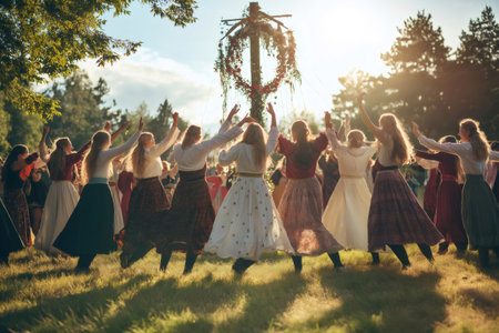 Scandinavian women wearing traditional clothing dancing around a maypole during a Midsummer celebration in a sunny field