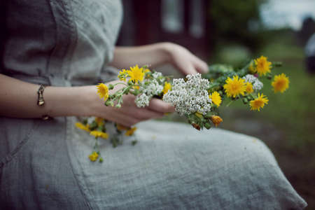 Cottagecore, simple living, country aesthetic lifestyle, modern rural fantasy, pastoral aesthetic. Young girl in peasant Cottagecore dress with wildflowers enjoying nature on country farm