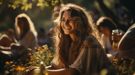 Happy group is relaxing, drinking beer, and having a picnic in the beautiful meadow.