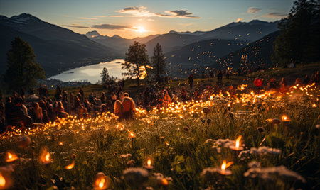 Summer solstice. A sense of celebration and connection to nature pervades the atmosphere, as people gather to acknowledge the sun's power and the abundance of the season. --no logo, brand, descriptions --ar 16:9 --style raw --stylize 700 Job ID: ac684b50-a22f-49f6-aff2-6ff54a841c20