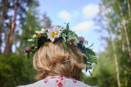 Summer solstice wreath of wild and garden flowers for a girl with blond hair and a braid on her head, handmade, individual parts in focus, summer day