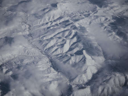 Aerial panorama view of snow covered mountain range peaks winter landscape seen from airplane window over Turkey Europe Asia