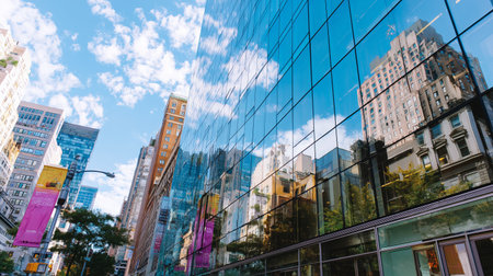 Reflections from the glass buildings on a busy street in a city during the day