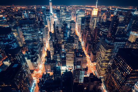 Aerial view of New York City Manhattan at night, USA.
