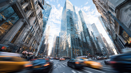 A vibrant urban scene highlighting towering skyscrapers with motion blur from passing vehicles, capturing the essence of city life and its energetic atmosphere.
