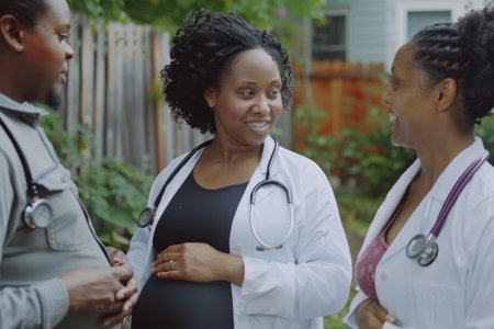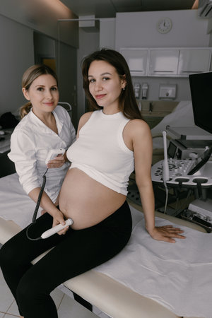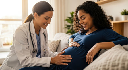 A smiling female doctor in a white coat examines a happy pregnant woman belly during a home visit or consultation. This scene depicts prenatal care, health support, and maternity.