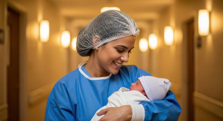 Smiling female nurse in blue scrubs and hair net gently holds a swaddled newborn baby, symbolizing new life, care, and medical support in a hospital environment.