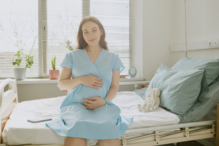 Young pregnant female patient smiling gently and caressing her tummy while she sitting on bed at maternity hospital