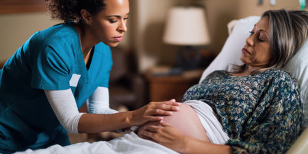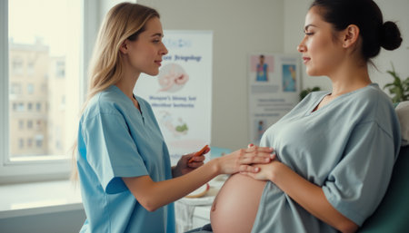 Nurse carefully examining a pregnant woman's abdomen during a prenatal check-up, offering support and monitoring the progress of her pregnancy in a healthcare setting