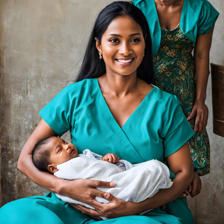 A woman in a green scrub suit holding her newborn baby, AI