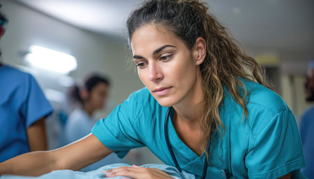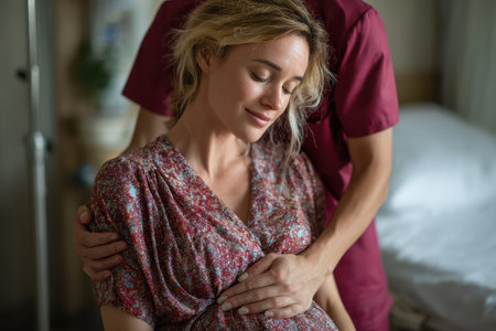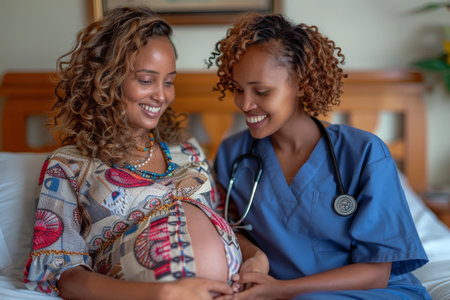In a serene medical setting, a compassionate nurse gently touches the belly of a pregnant woman, radiating warmth and support. The atmosphere is filled with anticipation and care, as the nurses attentive gaze and the mothers serene expression create a beautiful bond of trust and hope.