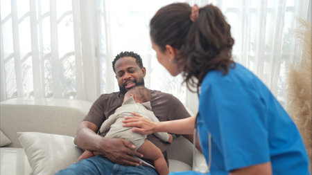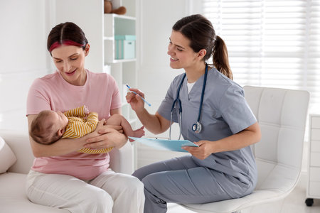 Visit mother with baby in hospital, talking pediatrician doctor and young woman. Children medical care, health, help