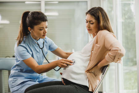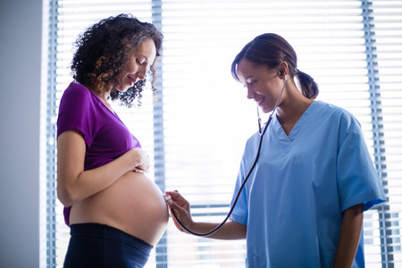 Medium close up of pregnant woman holding her belly while obstetrician checking heartbeat of fetus