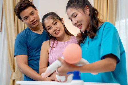 Close up nurse show or demonstration the good practice of take a bath newborn baby for man and pregnant woman in their house.