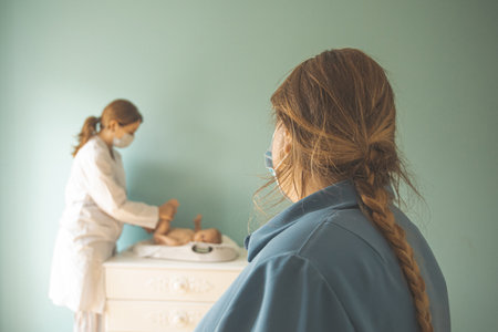 Young female doctor helping newborn baby and testing